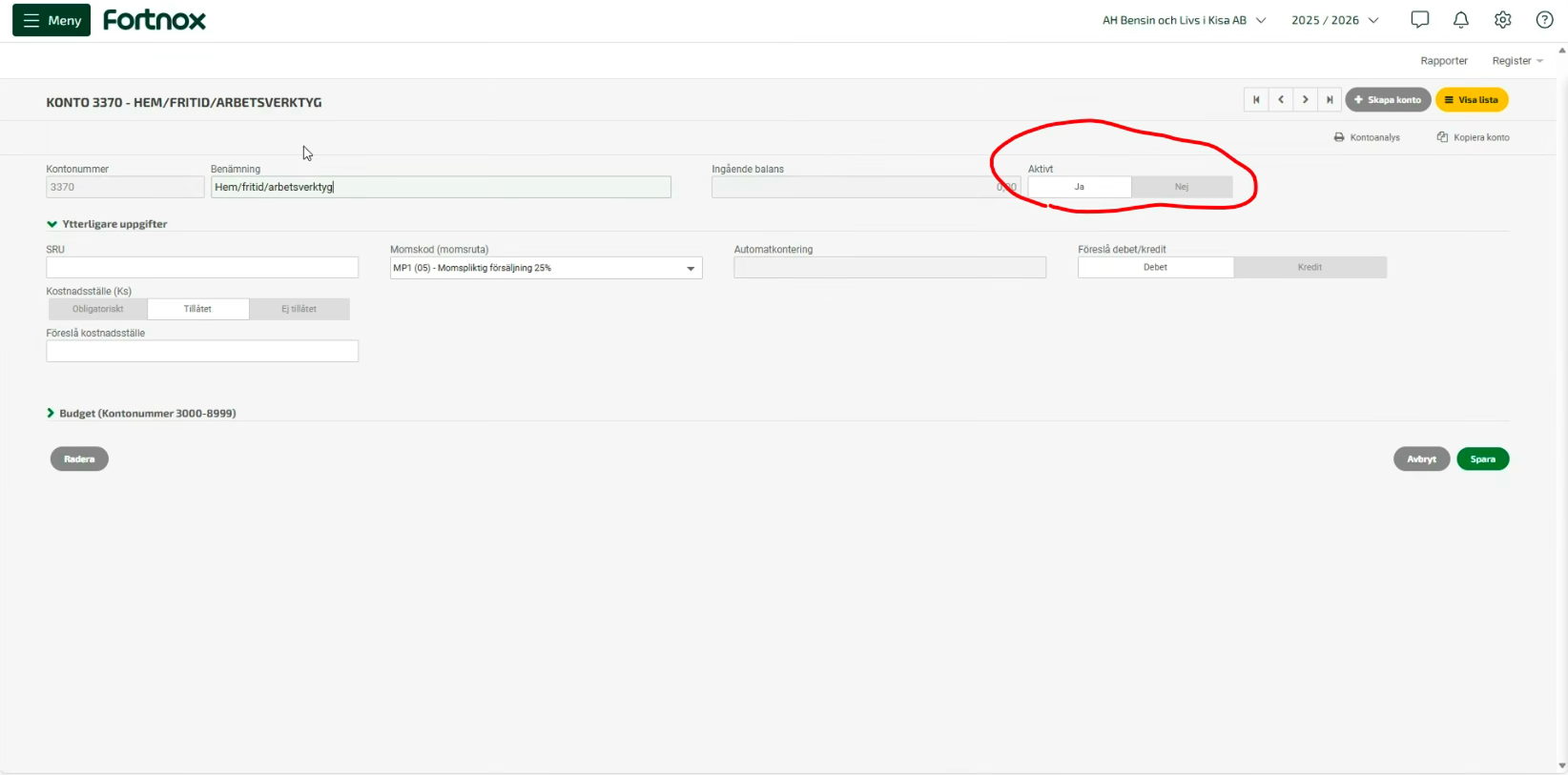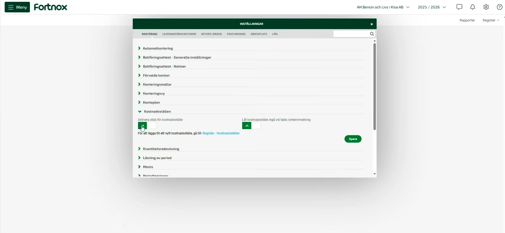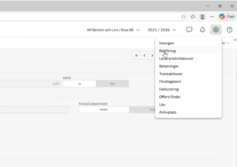 Cost center needs to be active in Fortnox for the integration to work. This is activated as follows: Press the gear and select accounting.