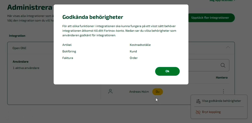 Check permissions. For stores that have Fortnox through an agency, in some cases it may be required that the agency reviews and sets the correct permissions for the person who will carry out the integration. Below you can see an image of the permissions that the integration requires.