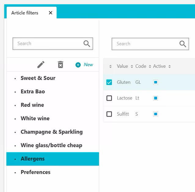 Allergens and Preferences are set up using Article Filters. We have added Article Filter Types “Allergens” and “Preferences”. Set up “Allergens” as a filter group with Type “Allergens”, and equally for Preferences. Then add the allergens and preferences you want to be able to filter in the Express Checkout as filter items. Article Filters must then be connected to the articles on the menu.