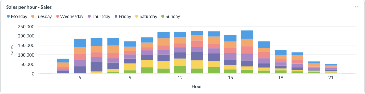 Sales per Hour - A detailed breakdown showing sales activity throughout the day, broken down by each day of the week. This visualization helps you spot peak hours and optimize operations.
