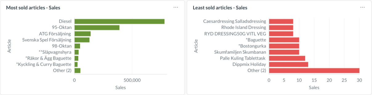 Least Sold Articles - View products with the lowest sales performance. Important note: This only includes items that have actually been sold during the selected period—products with zero sales won't appear here.