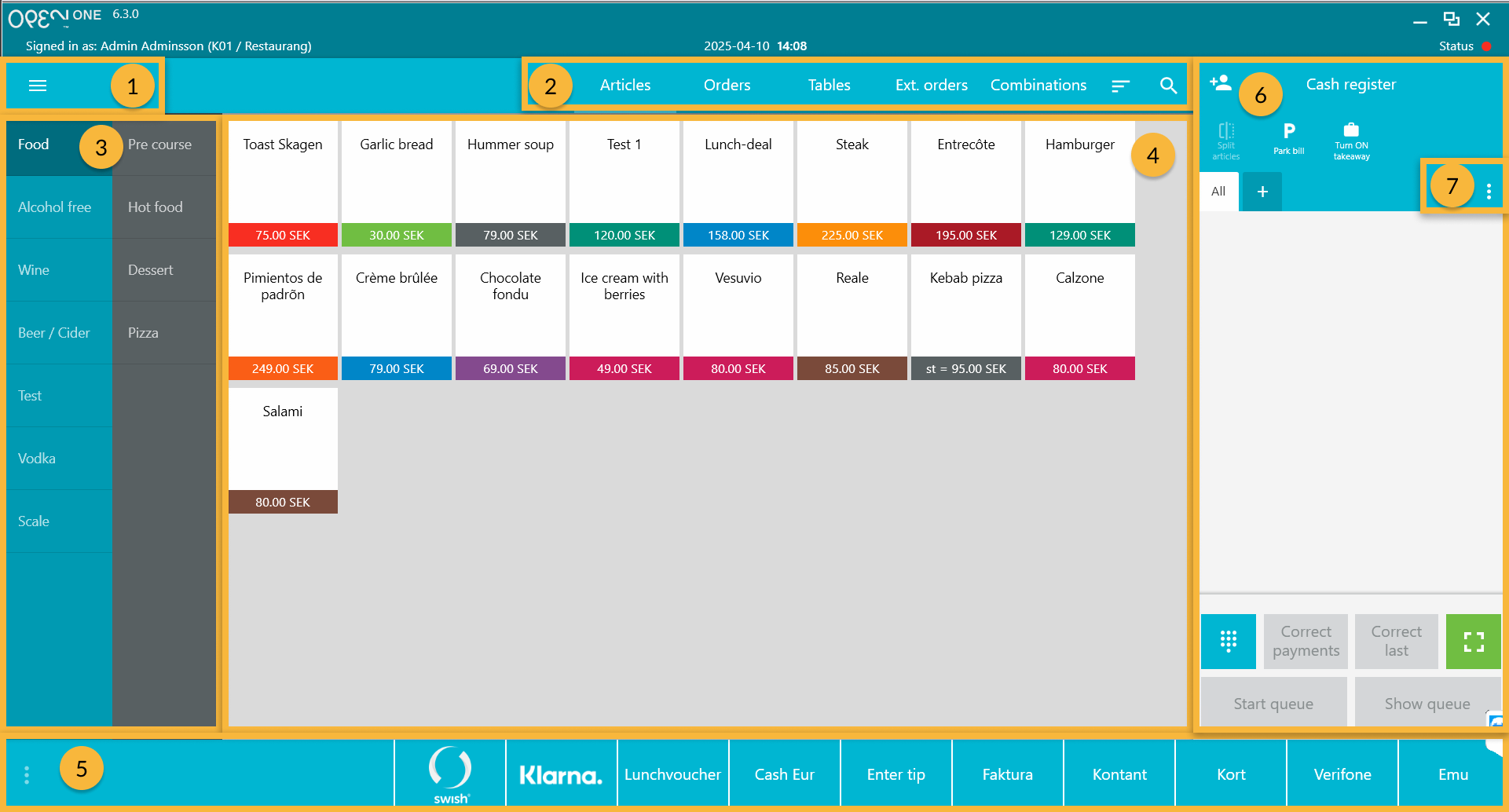 Cart view: Here you can see the table or bill you are currently working on. You can also add a customer to the table or bill, send production tickets to the kitchen or bar, and there is a numeric keypad that you can use to enter number of articles or amount for payment.