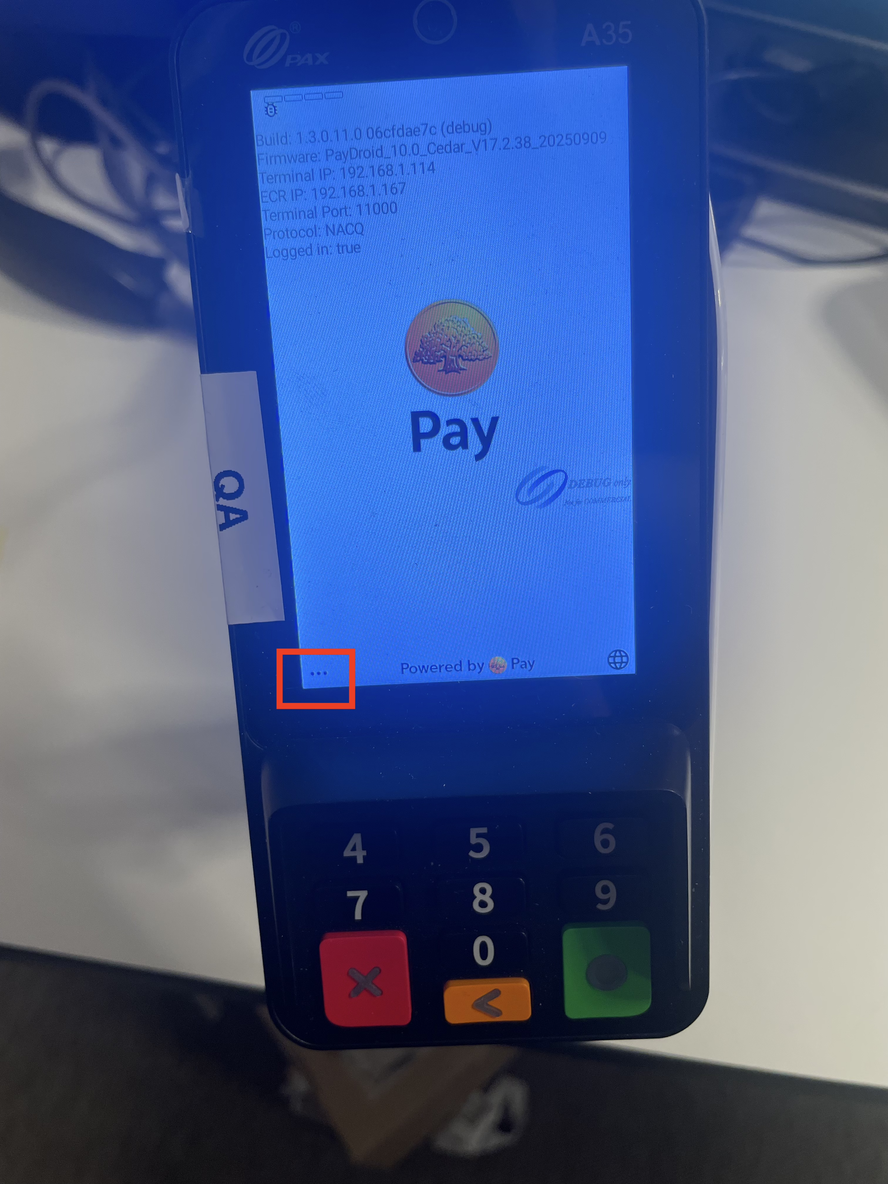 1. To access the menu on the card terminal, click on the three dots in the lower left corner of the display.