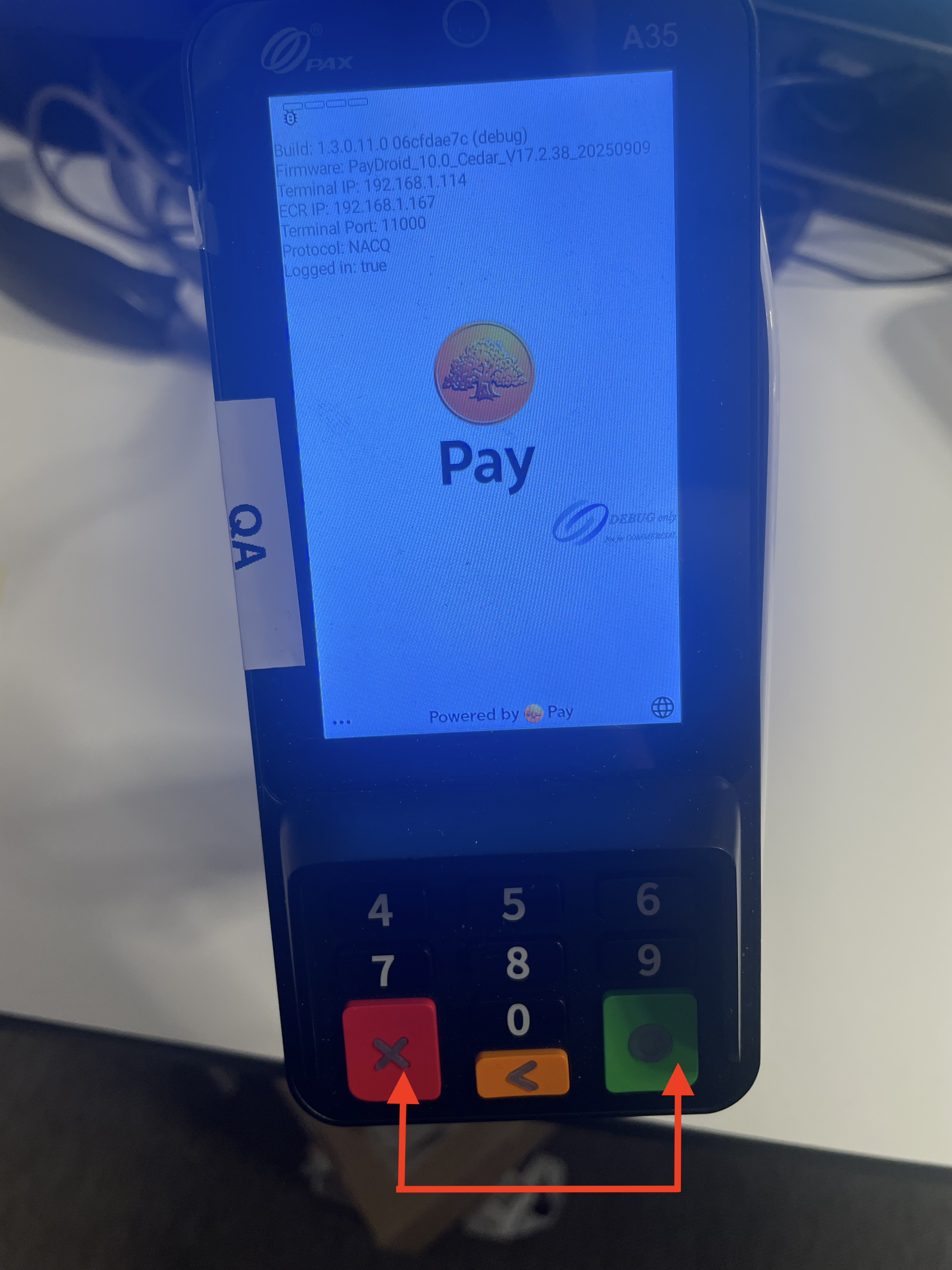 You can also restart the terminal by holding down the green and red button simultaneously on the card terminal (The image shows the shortcut from the home page).