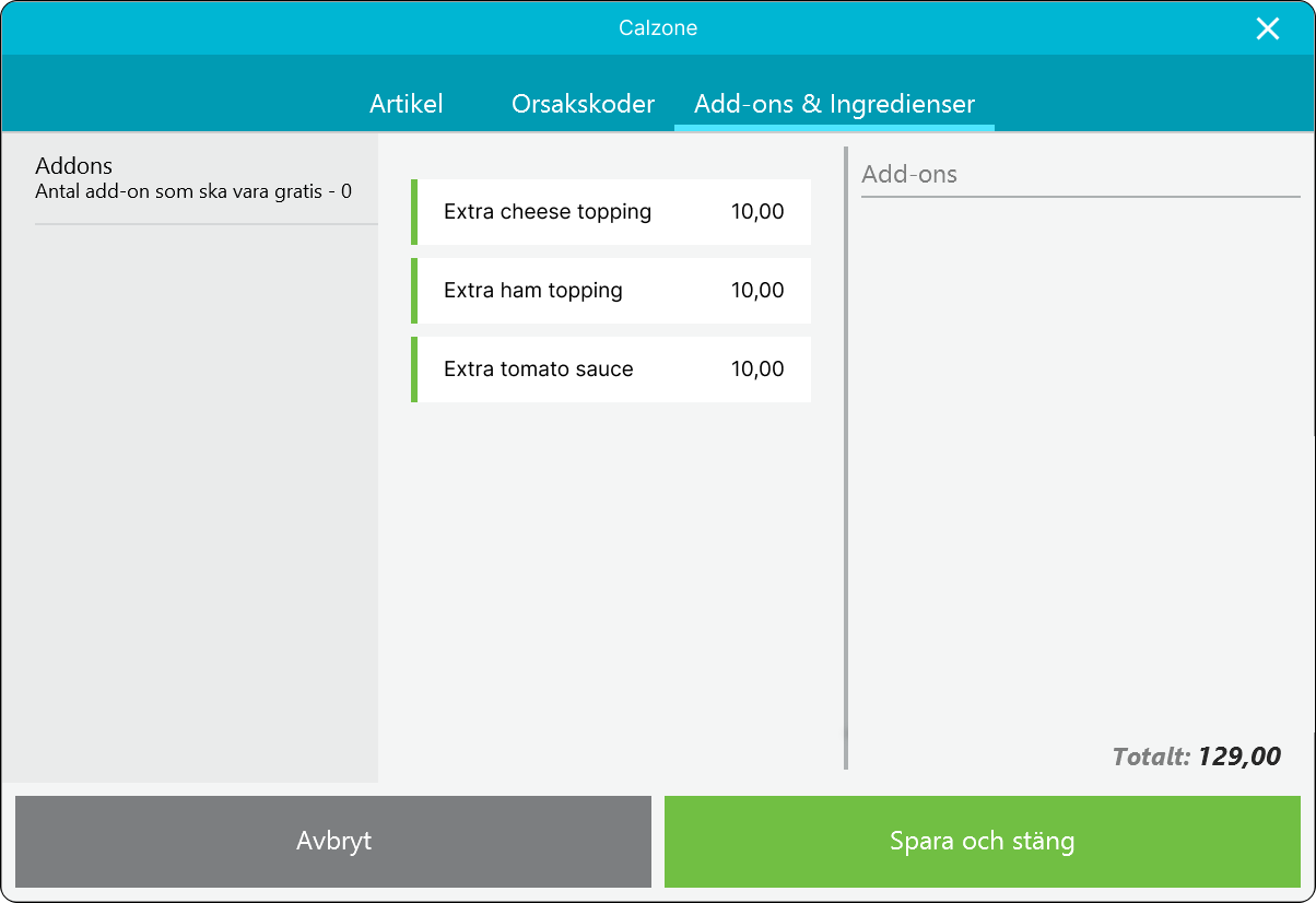 När du lägger till en artikel med add-ons (t.ex. en pizza) i varukorgen visas en dialog där du kan välja de tillval kunden vill ha.