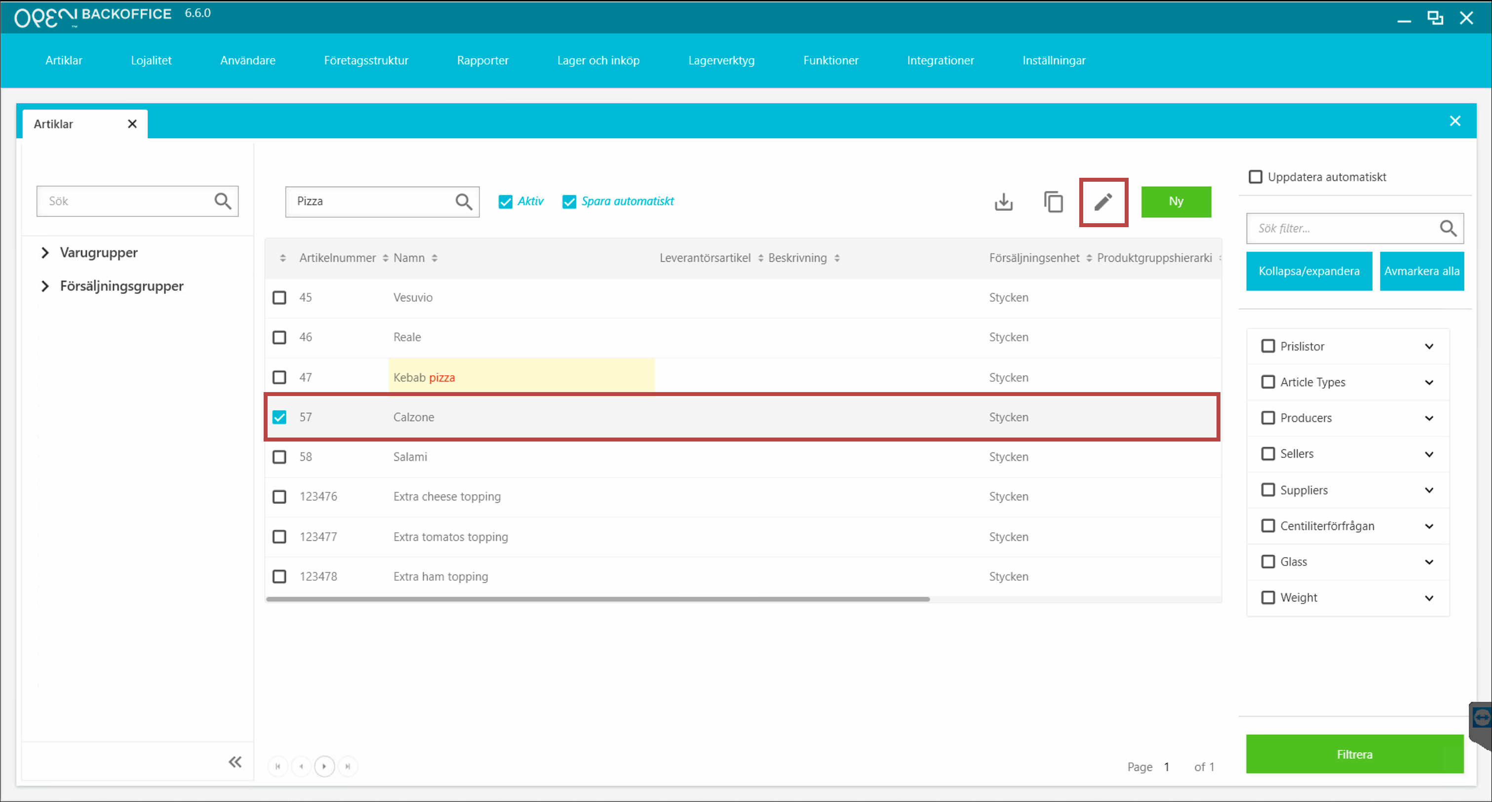 Hitta artikeln som ska kopplas till add-on-gruppen och klicka på redigeringsknappen. (Exempel: redigera artikeln “Calzone”)