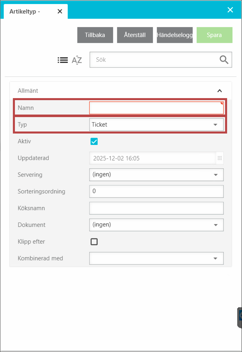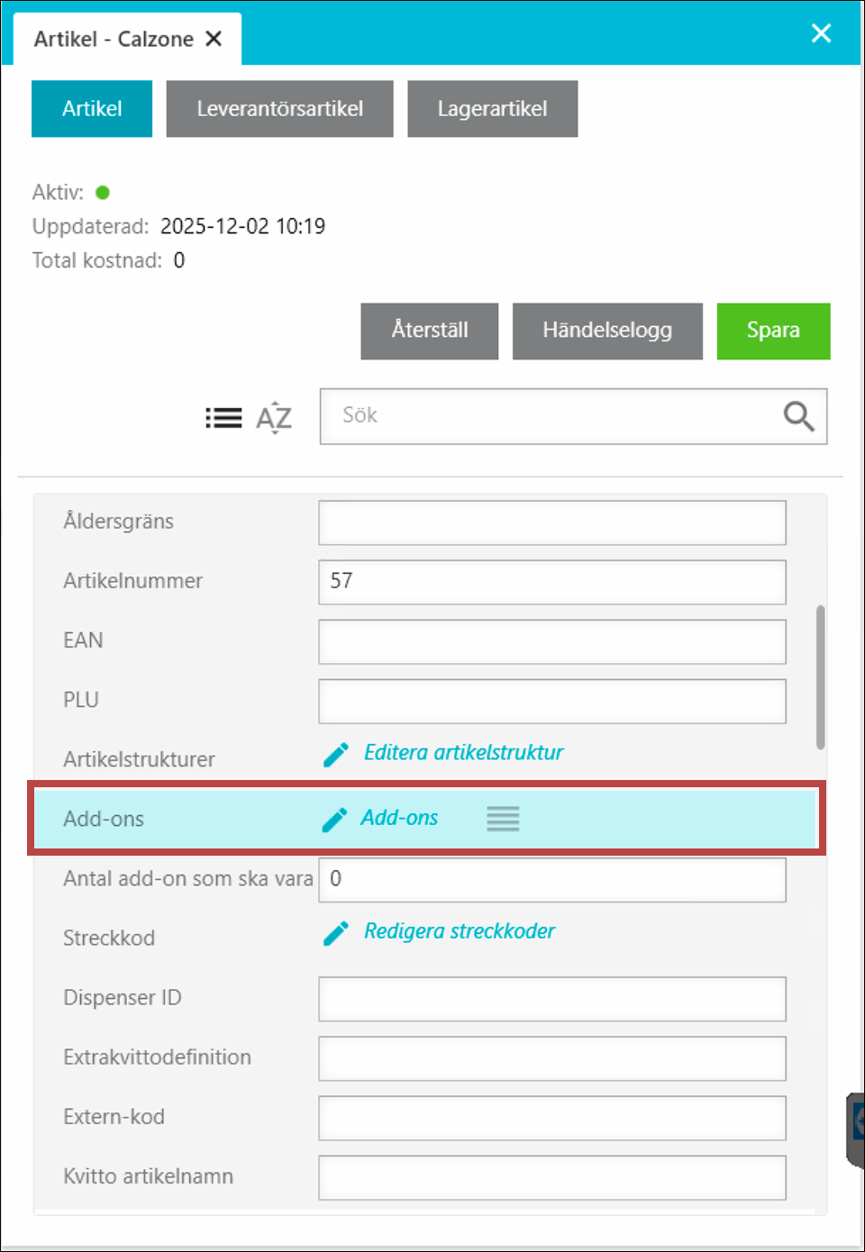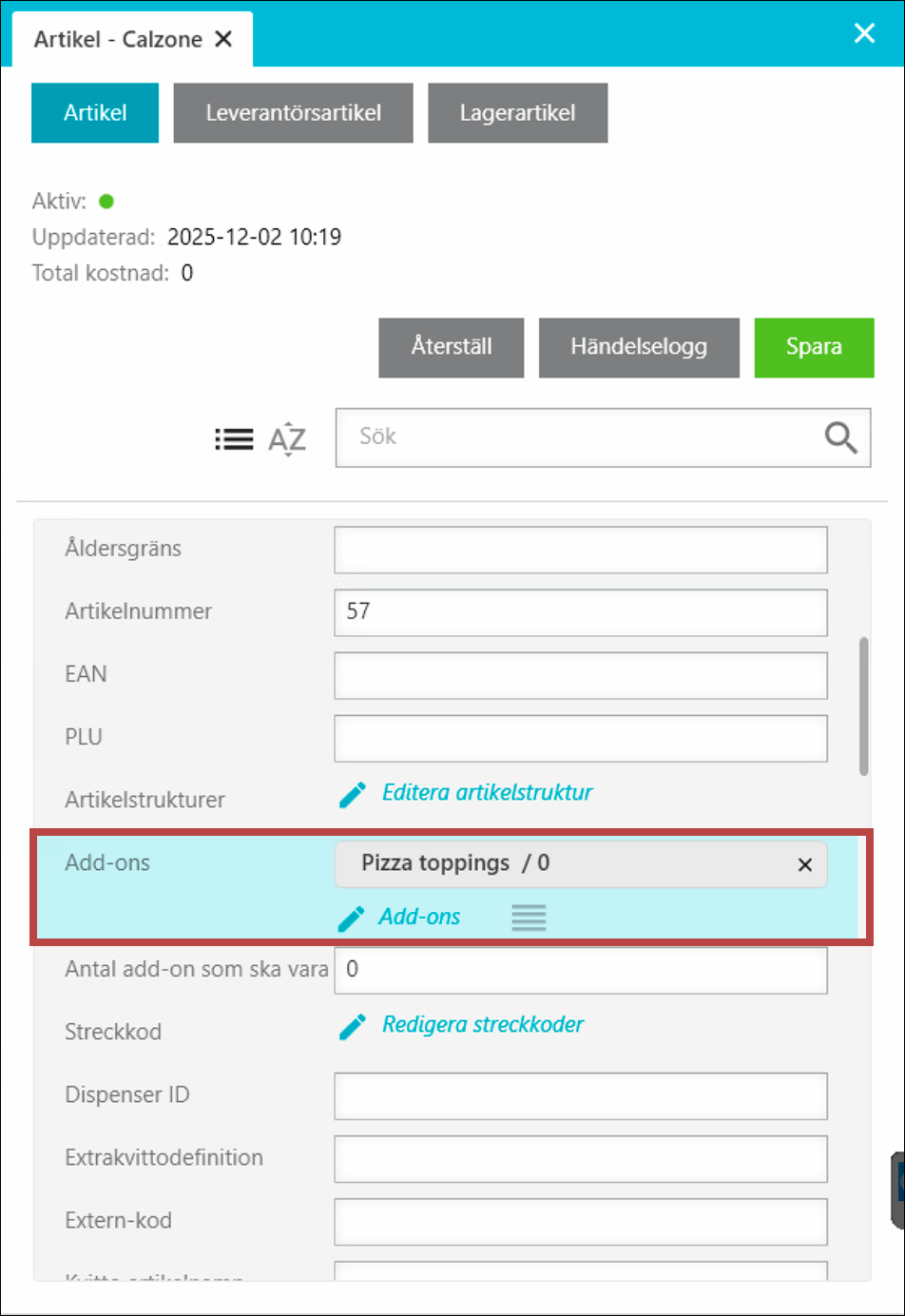 - Sorteringsordning: Används om artikeln har flera add-on-grupper och du vill styra i vilken ordning de visas (lägre siffra = högre prioritet).