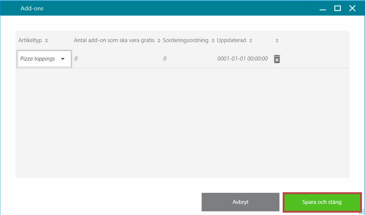 Senare kommer du att ansluta flera add-ons — som Extra ost, Extra skinka, osv. — till denna grupp. En add-on-grupp kan återanvändas av flera olika artiklar (t.ex. alla pizzor på menyn).
