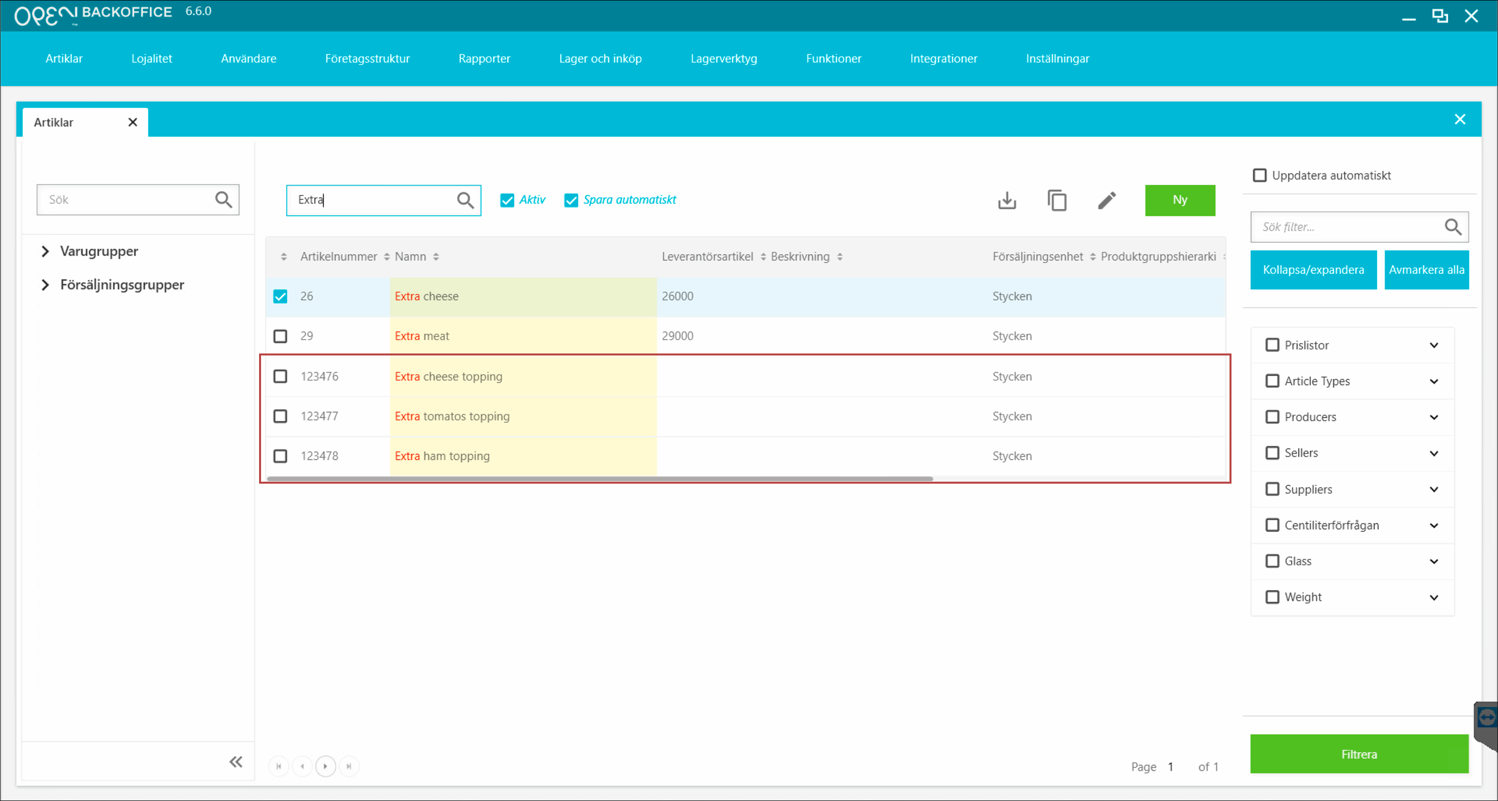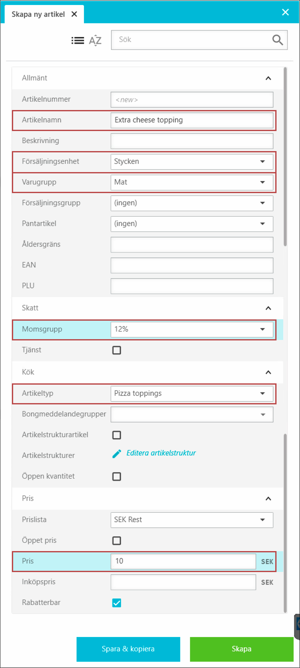 Nu är det dags att skapa själva tillvalsartikeln, t.ex. Extra ost eller Extra skinka.