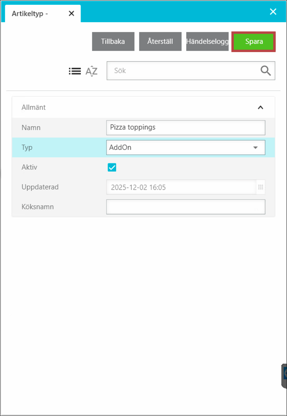 Innan du skapar enskilda add-ons måste du först skapa en artikeltyp av typen AddOn. Du kan tänka på detta som en add-on-grupp (t.ex. “Pizza toppings”).