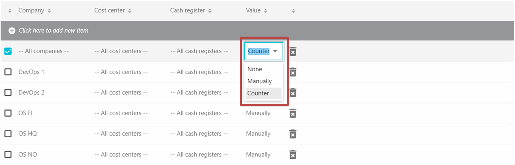 - Välj ett alternativ för ditt företag eller för specifika kostnadsställen eller kassor. Välj mellan att använda en räknare, manuellt ange ett ordernummer eller att inte använda ordernummer alls.