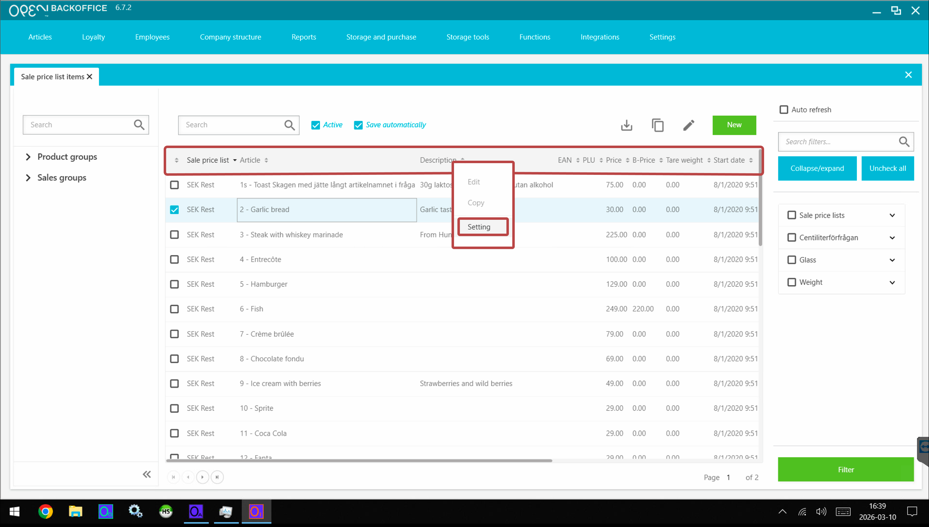 - Högerklicka på rubrikerna i tabellen och välj Inställningar.