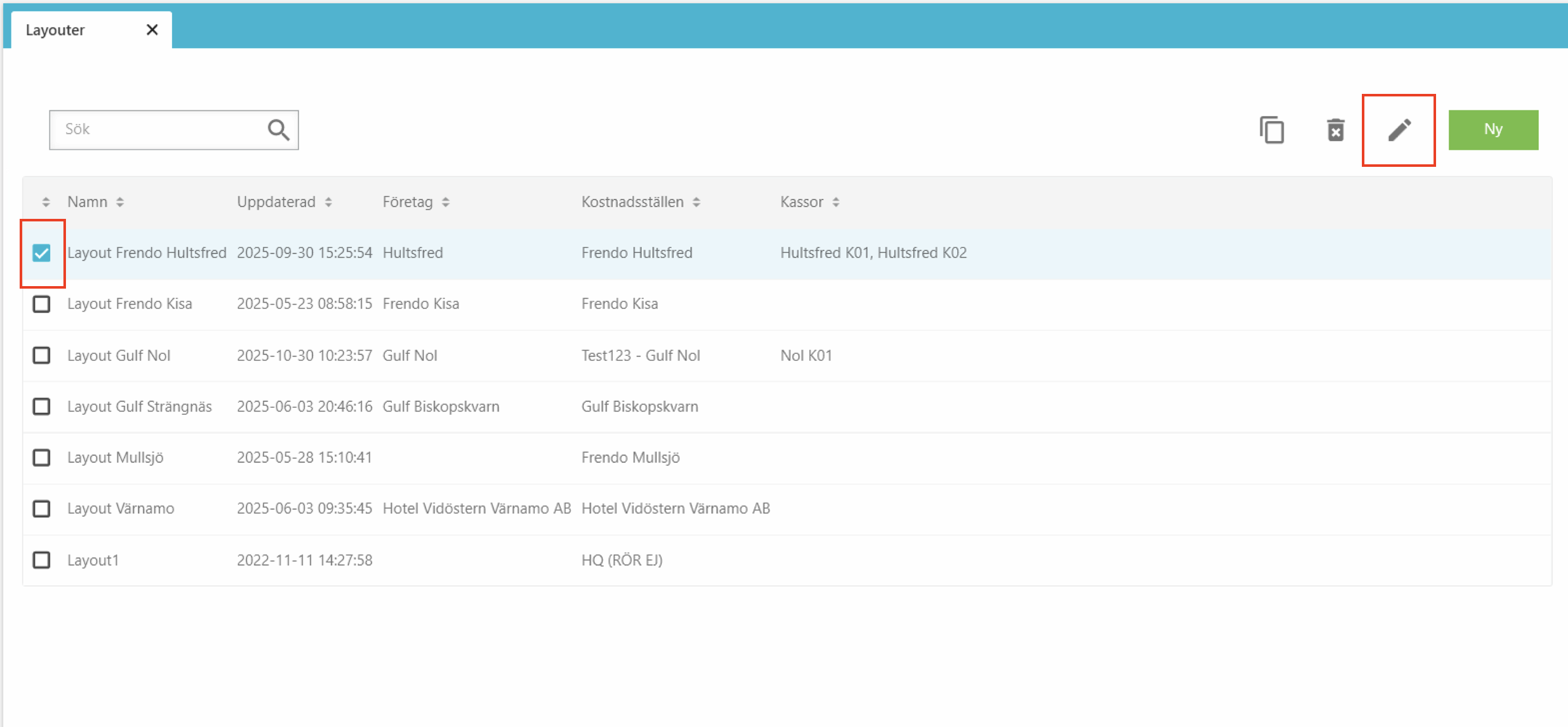 Välj de företag du ska ändra kassa-vyn på genom att bocka i checkboxen och klicka sedan på redigerings-knappen (Pennan).