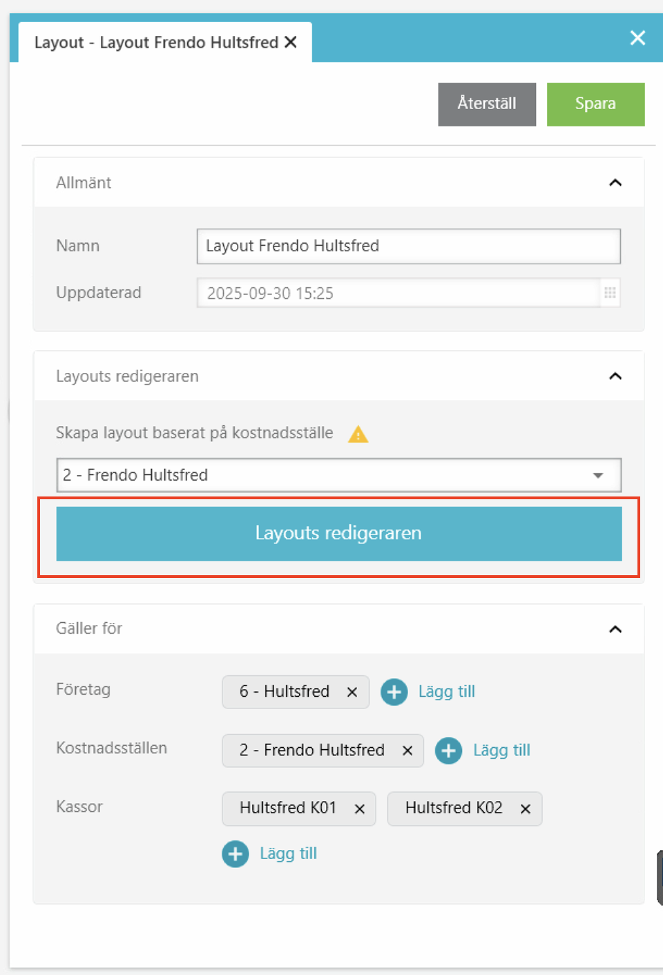 4. Till höger på skärmen visas Layout för det valda stället. Klicka på Layouts redigeraren.