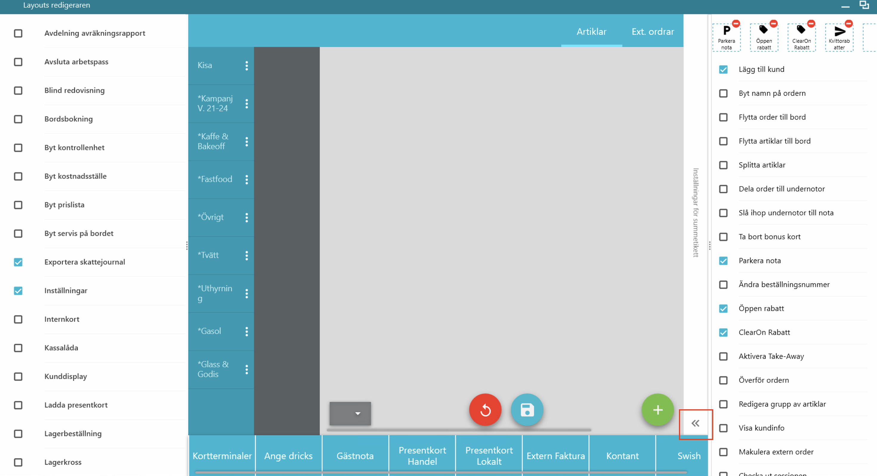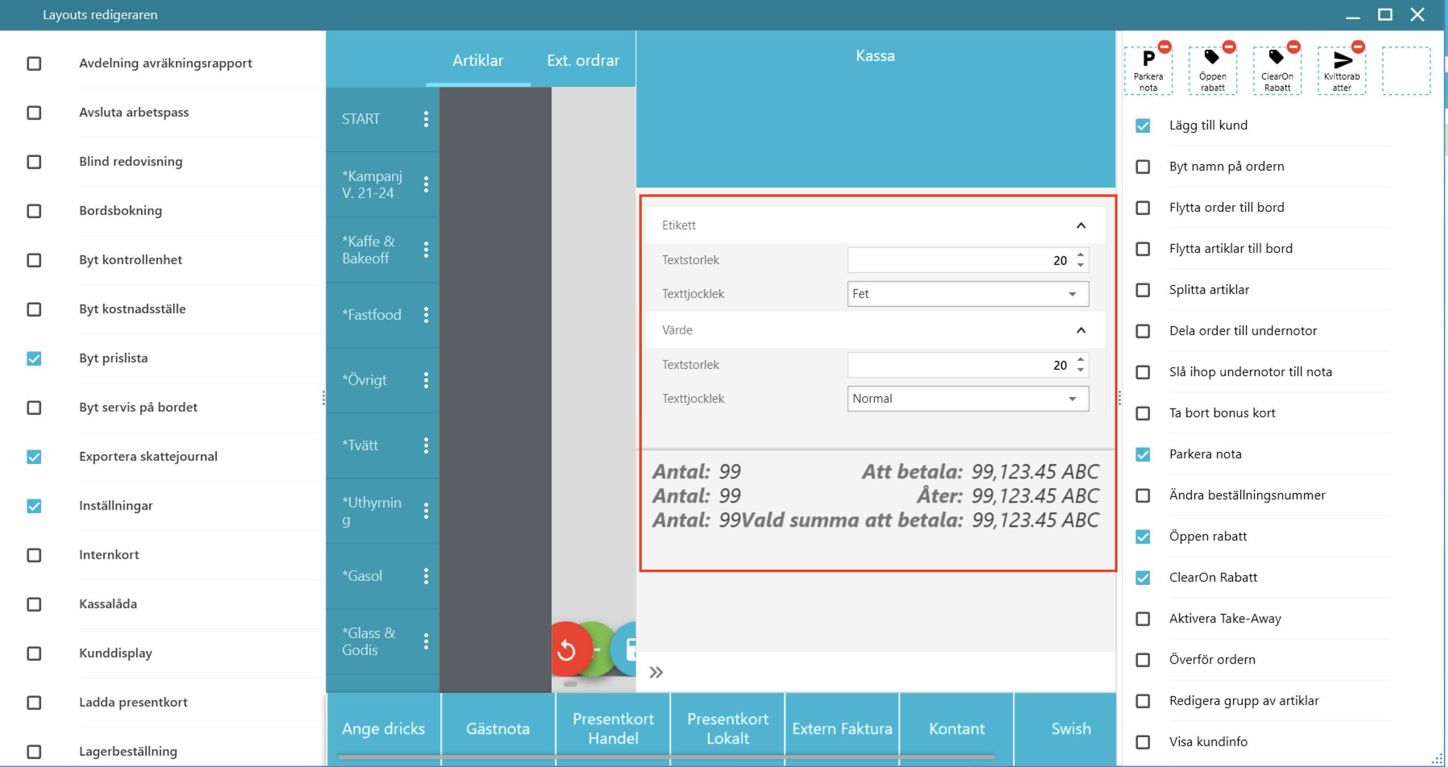 I layouts redigeraren kan man ändra kassans utseende på olika sätt och ta fram vad som ska visas i kassan.