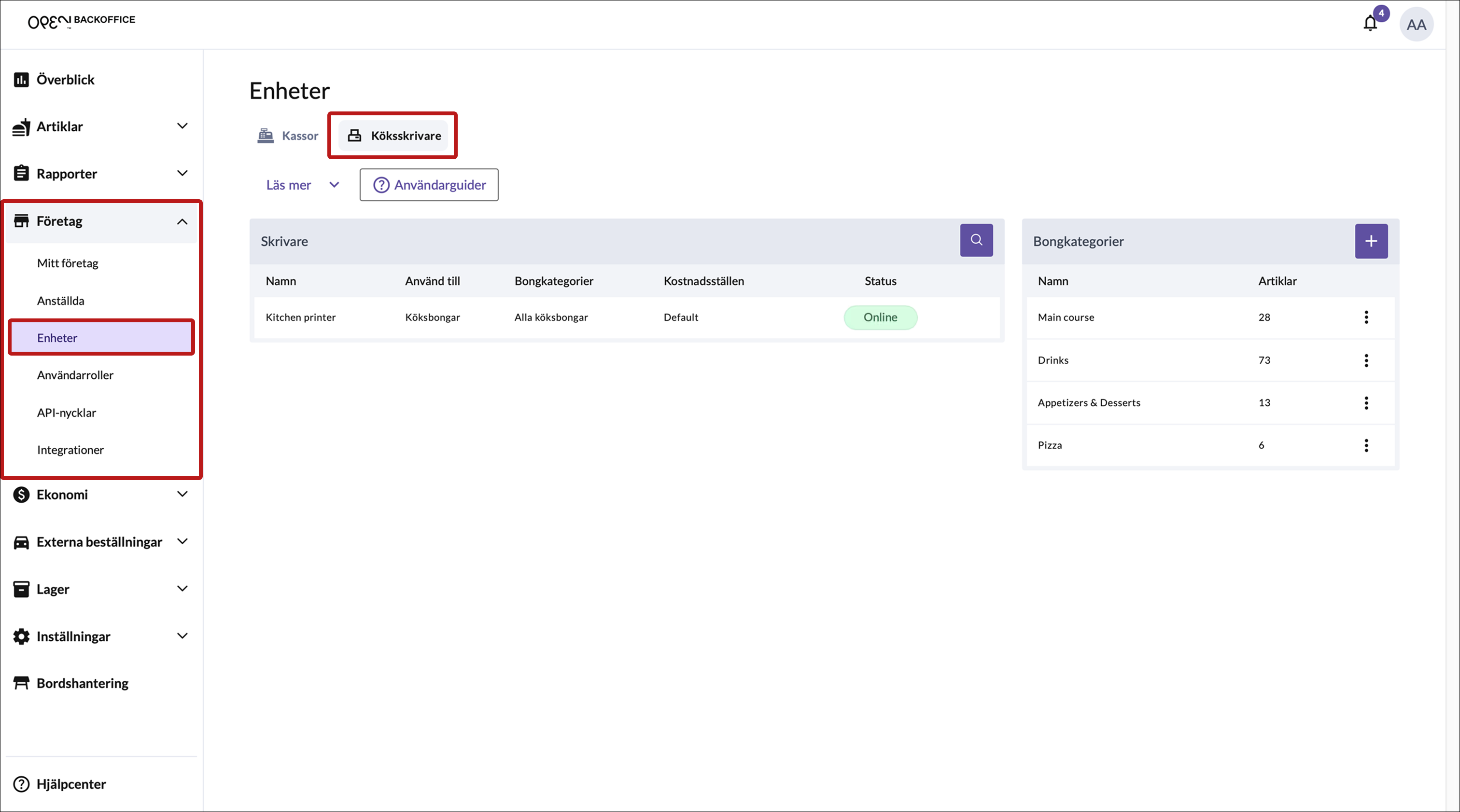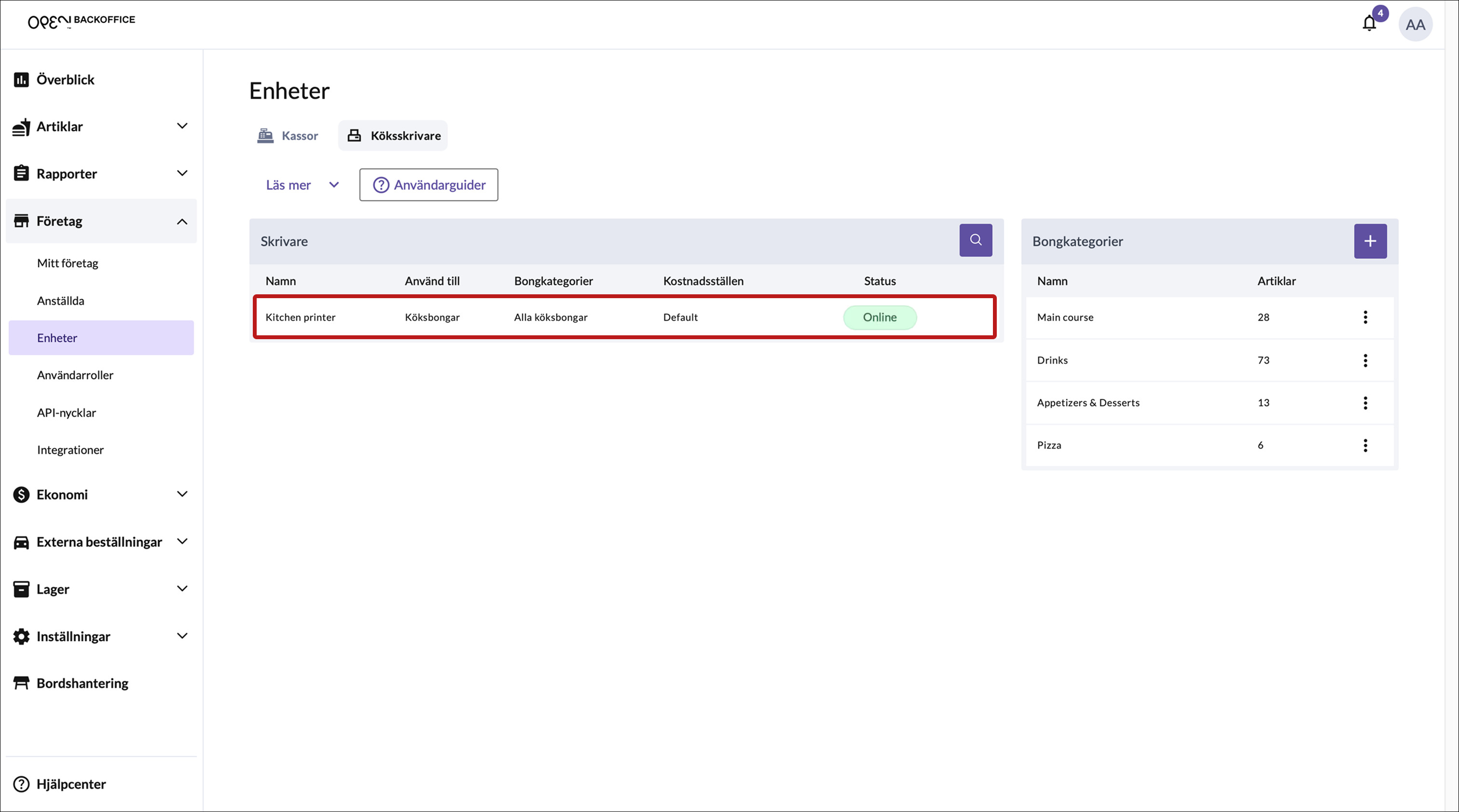 - Gå till Företag > Enheter och välj fliken Köksskrivare.