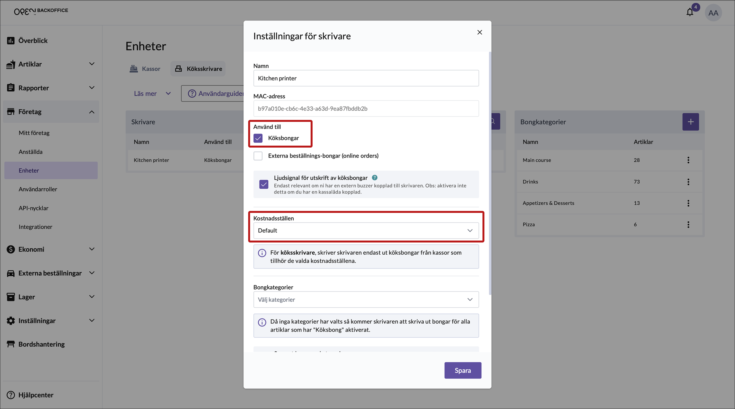 För att se till att skrivaren även kan skriva ut köksbongar, gör de sista inställningarna i BackOffice.