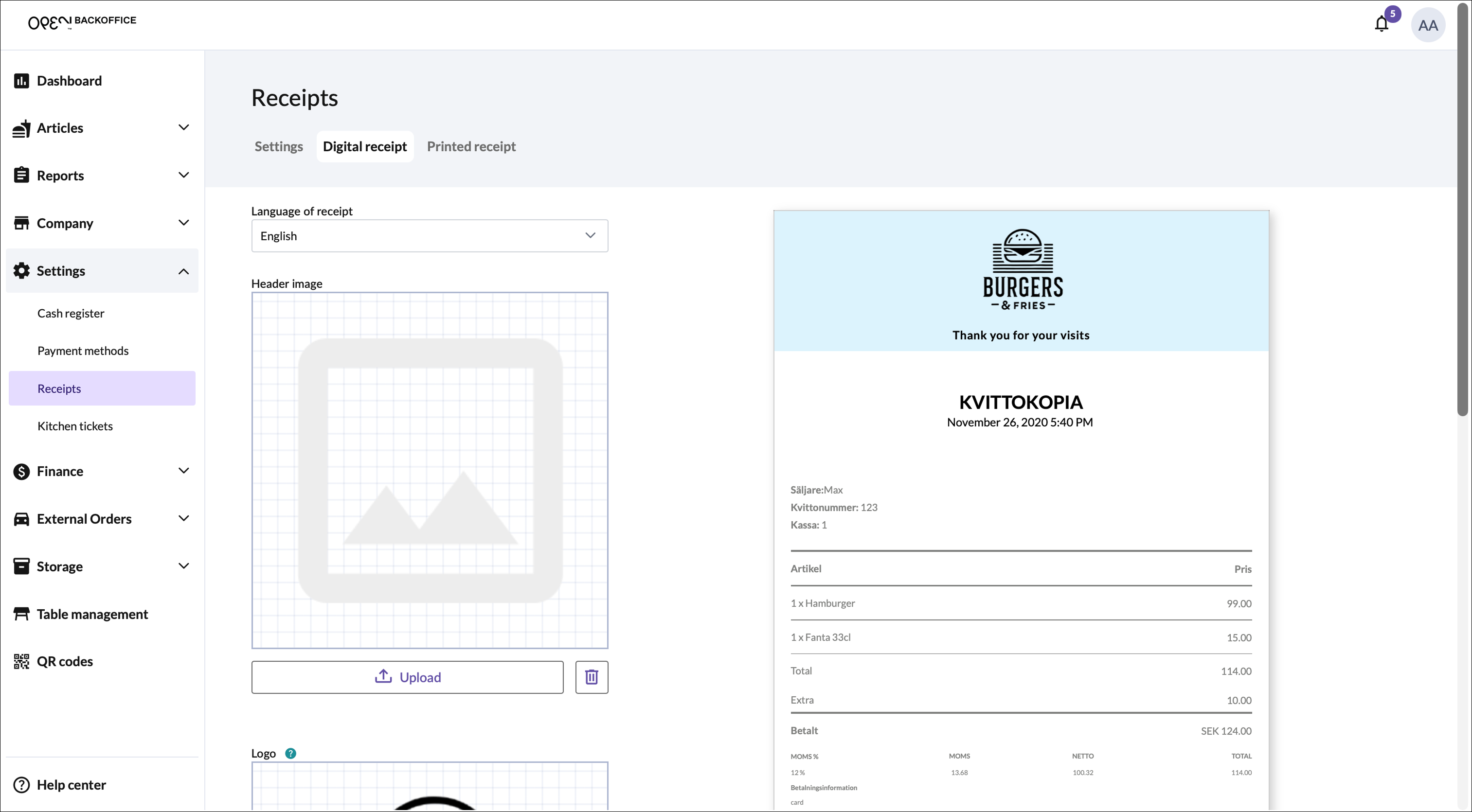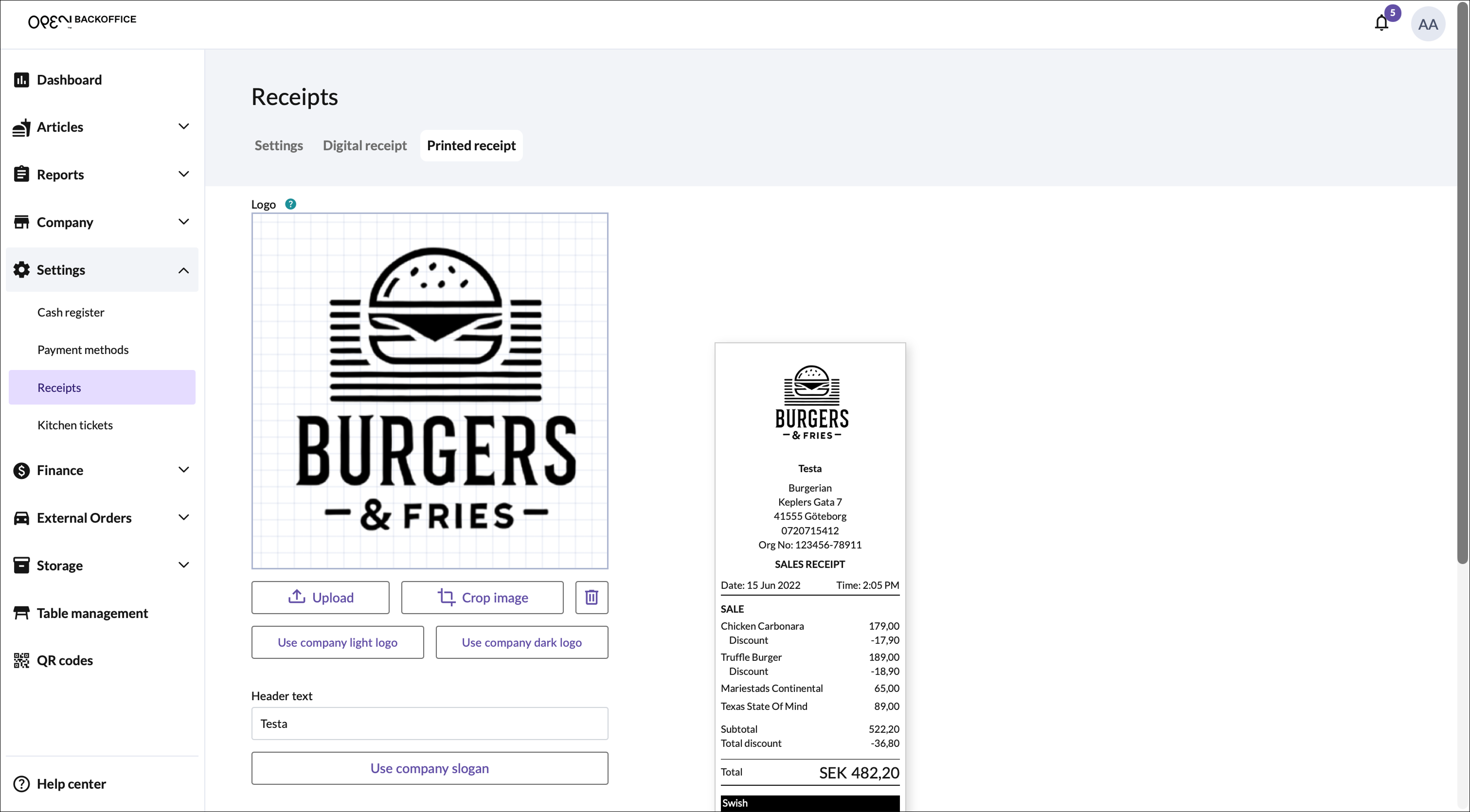 To customize your printed and digital receipts, go to Company -> Receipt design.