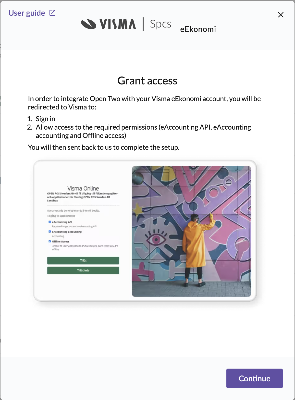 - You now need to give OPEN Two access to the necessary data in Visma Spiris. Press OK and you will be redirected to Visma Spiris.