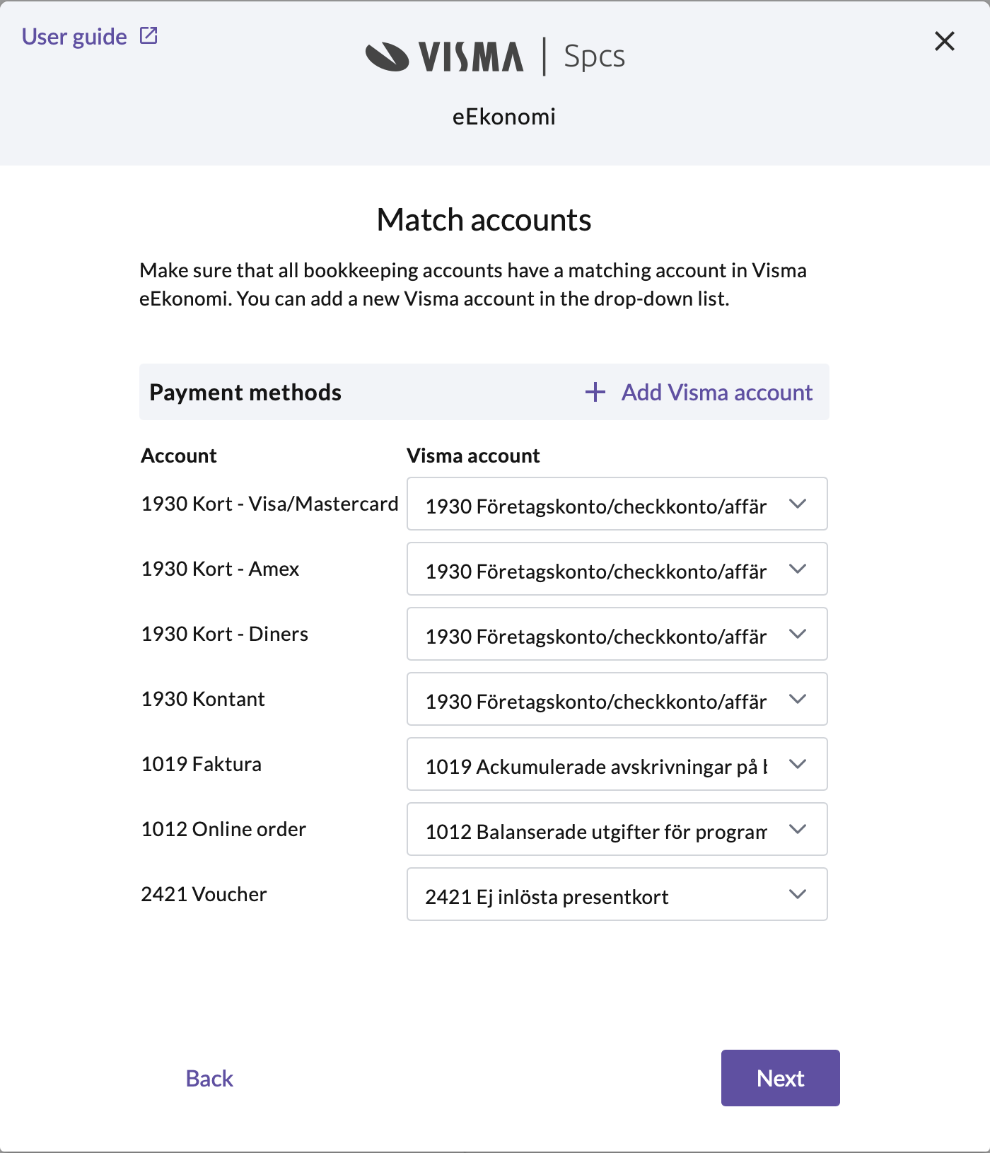 Select which accounting accounts should be used in Visma Spiris for your different payment methods. You can also add a new account from the list. Then press NEXT.