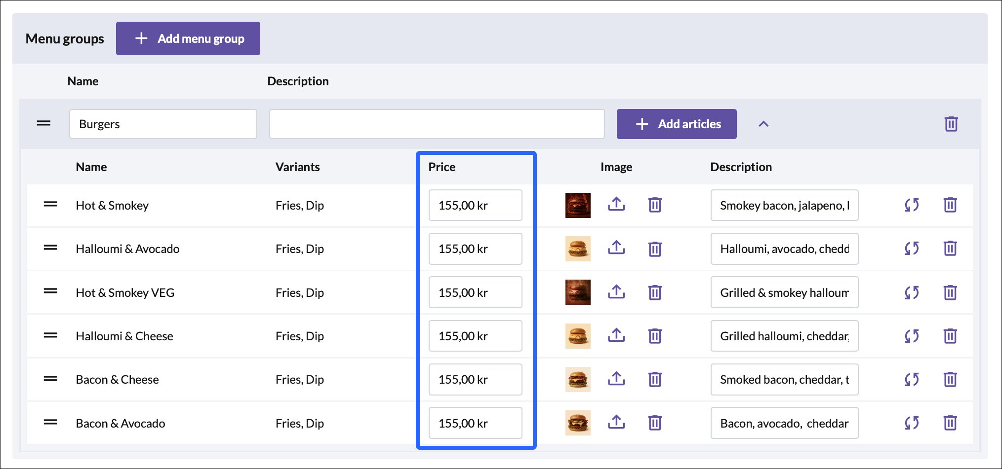 Prices are imported from the 'main articles', but you can update them for your menu - useful if you want to offer discounted prices at certain times (e.g. during lunch).