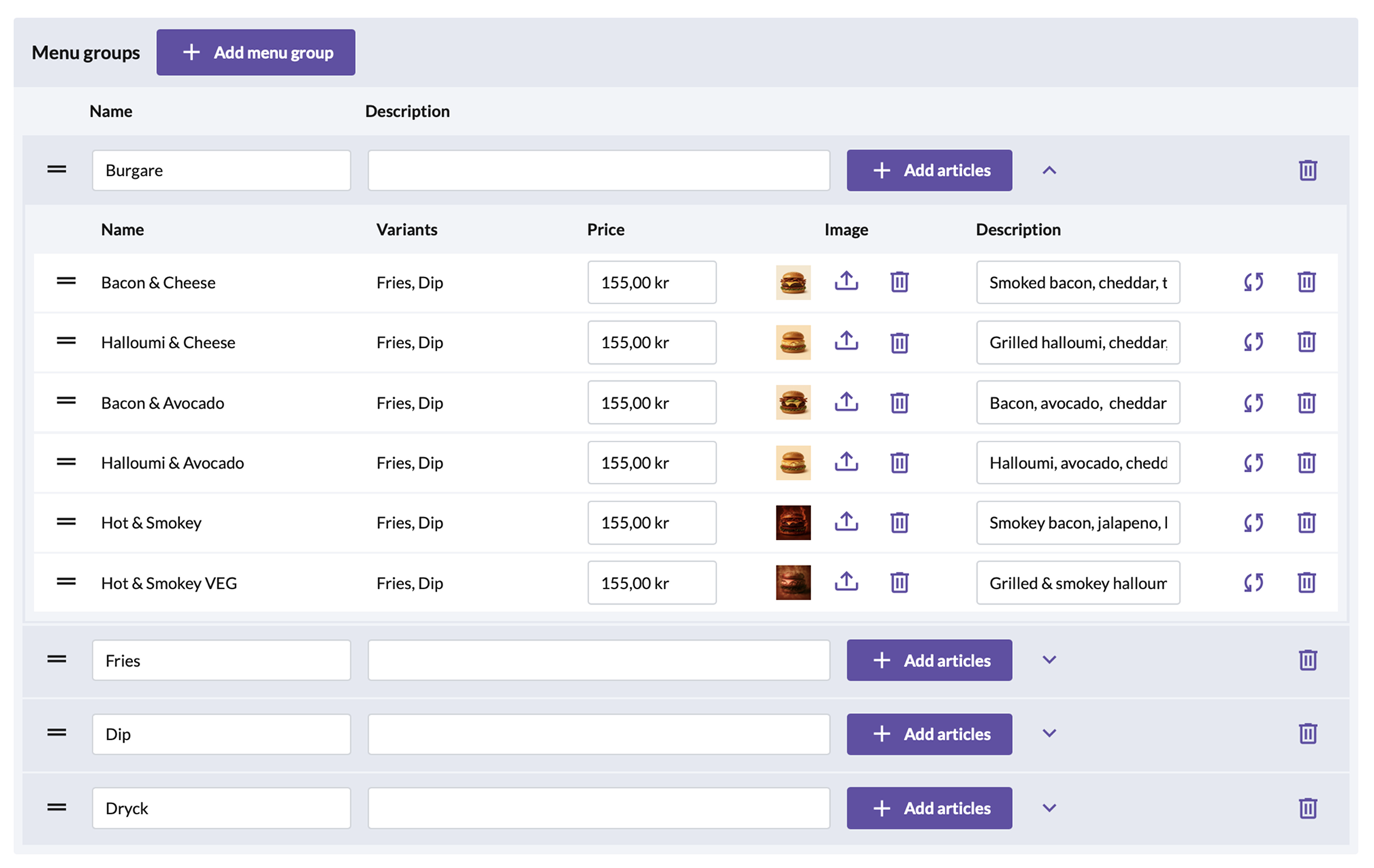Use menu groups to categorize your menu so it's easy for your customers to find what they want. In a lunch menu, you could for example have a menu group for drinks and another menu group for food.