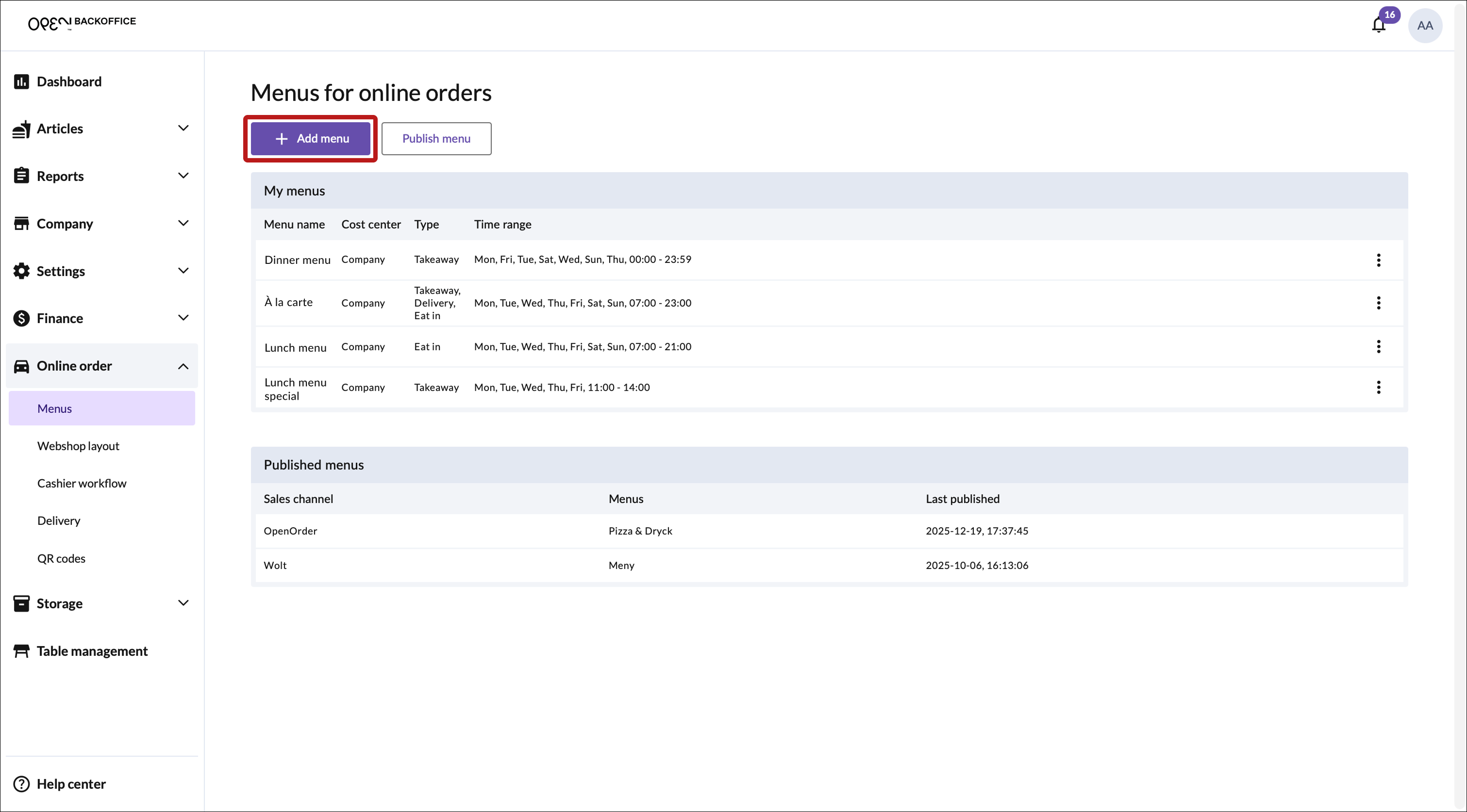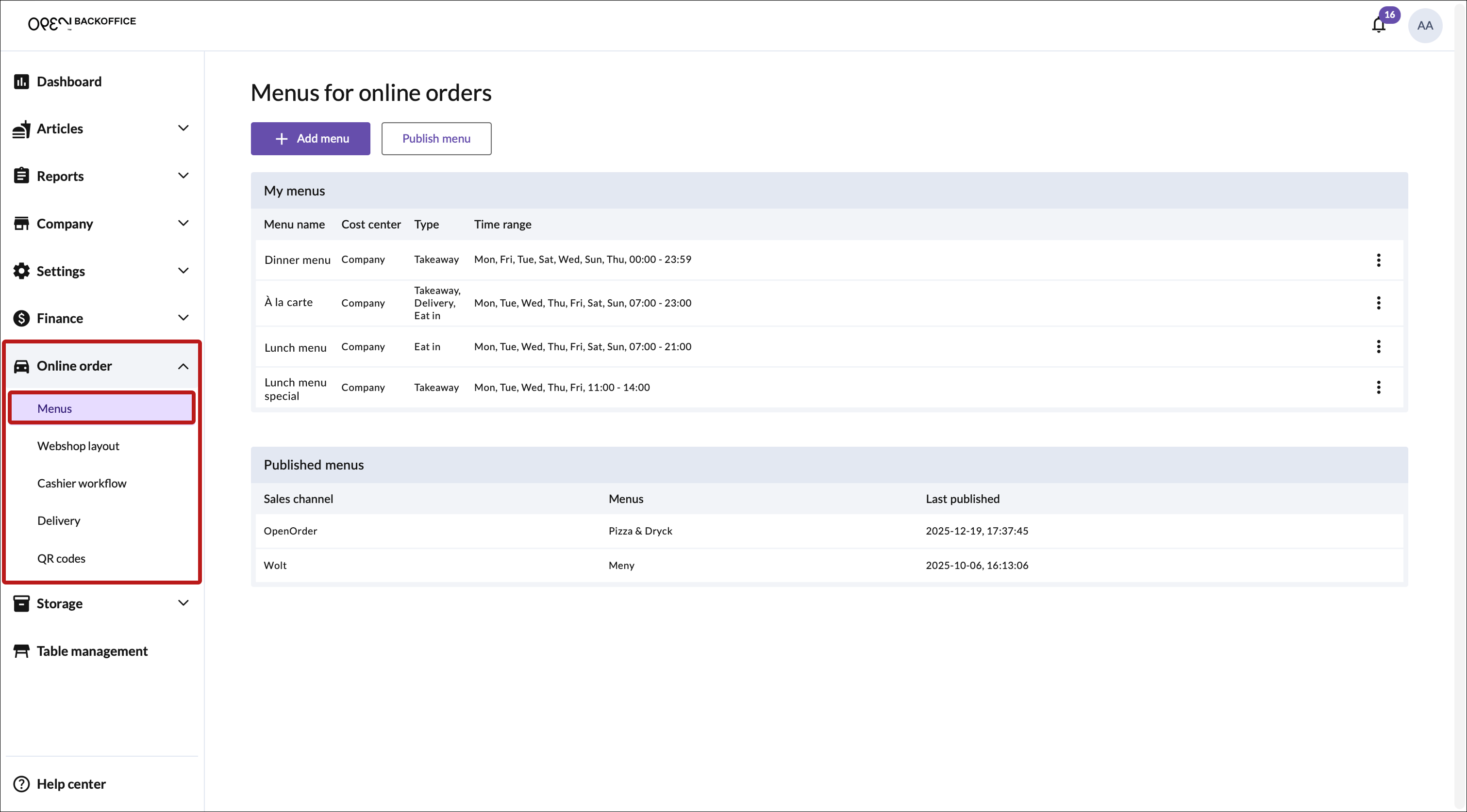 Go to 'Menus': In the left-hand menu, go to: Online order → Menus.