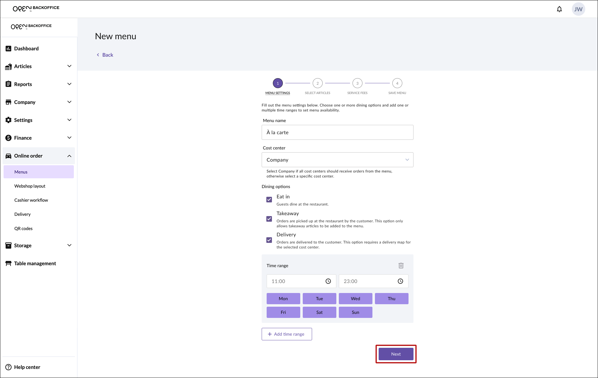 Note that you can have multiple time periods for a menu. Click the Add time range to add another one.