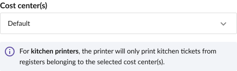 - If you have several cost centers, make sure to to specify which cost center(s) the printer should be linked to. This way, kitchen tickets are only printed when sales are made from cash registers within these cost centers.