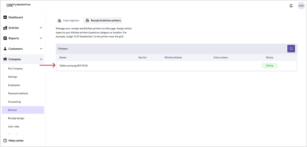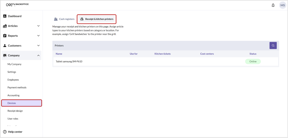 - Navigate to the Devices page under Company in the BackOffice menu. Next, choose the 'Receipt & kitchen printers' tab.