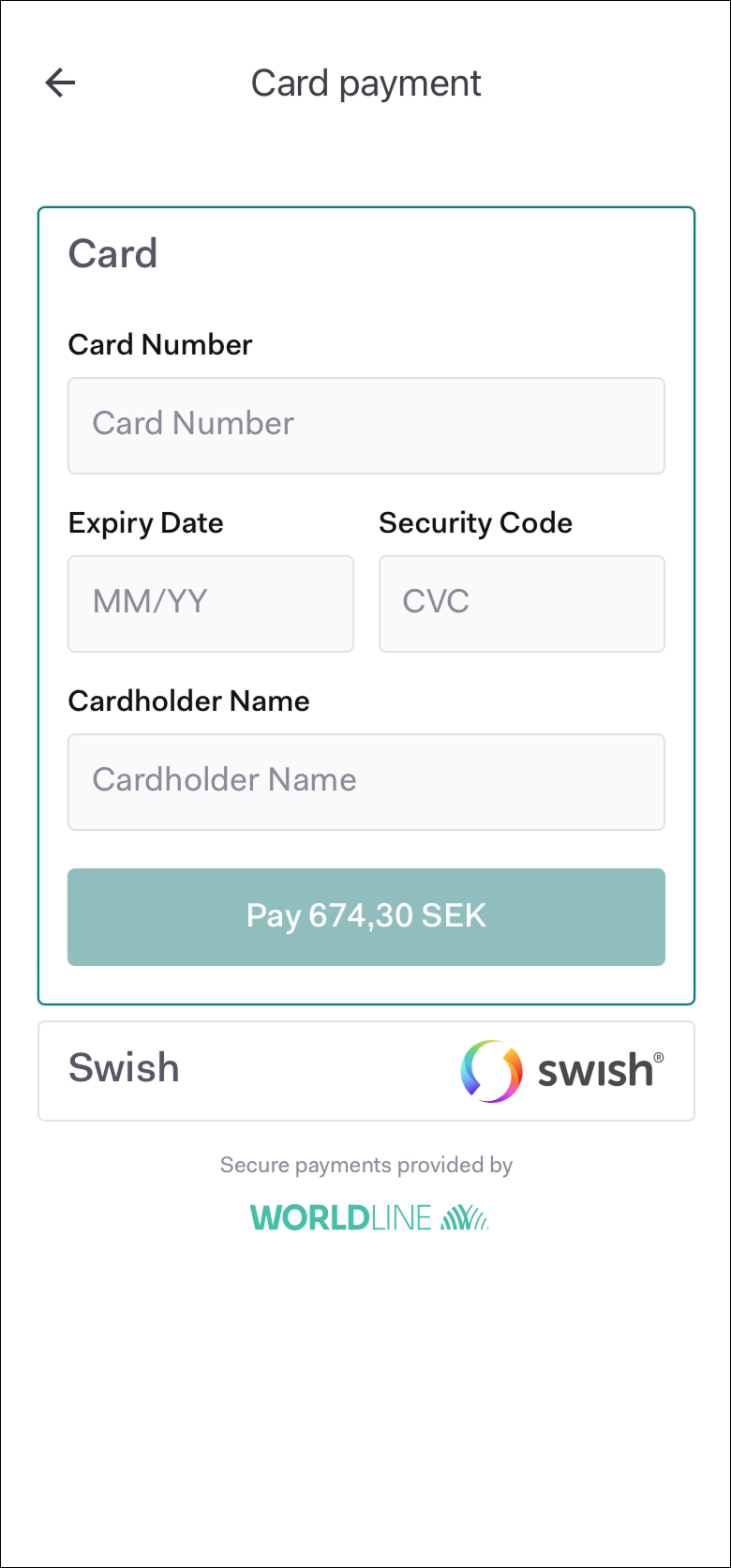 - Select a payment method: Card or Swish.