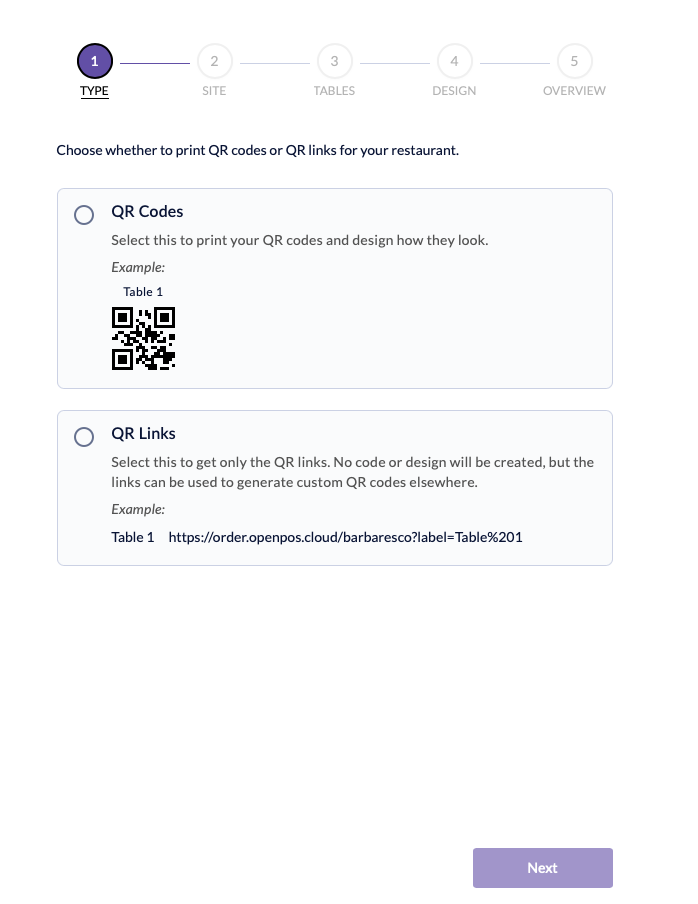 This is a a guide how to to create your qr codes in BackOffice. You find it in the menu to the left in BackOffice and the QR code stepper walks you through 5 steps: